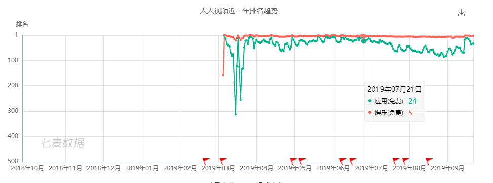 从七麦数据上可以看出,近半年来,人人视频在App Store娱乐榜上,排名一直稳定在前10名。而根据人人视频方面提供的数据,人人视频累计用户高达1.1亿、DAU达到了750万。