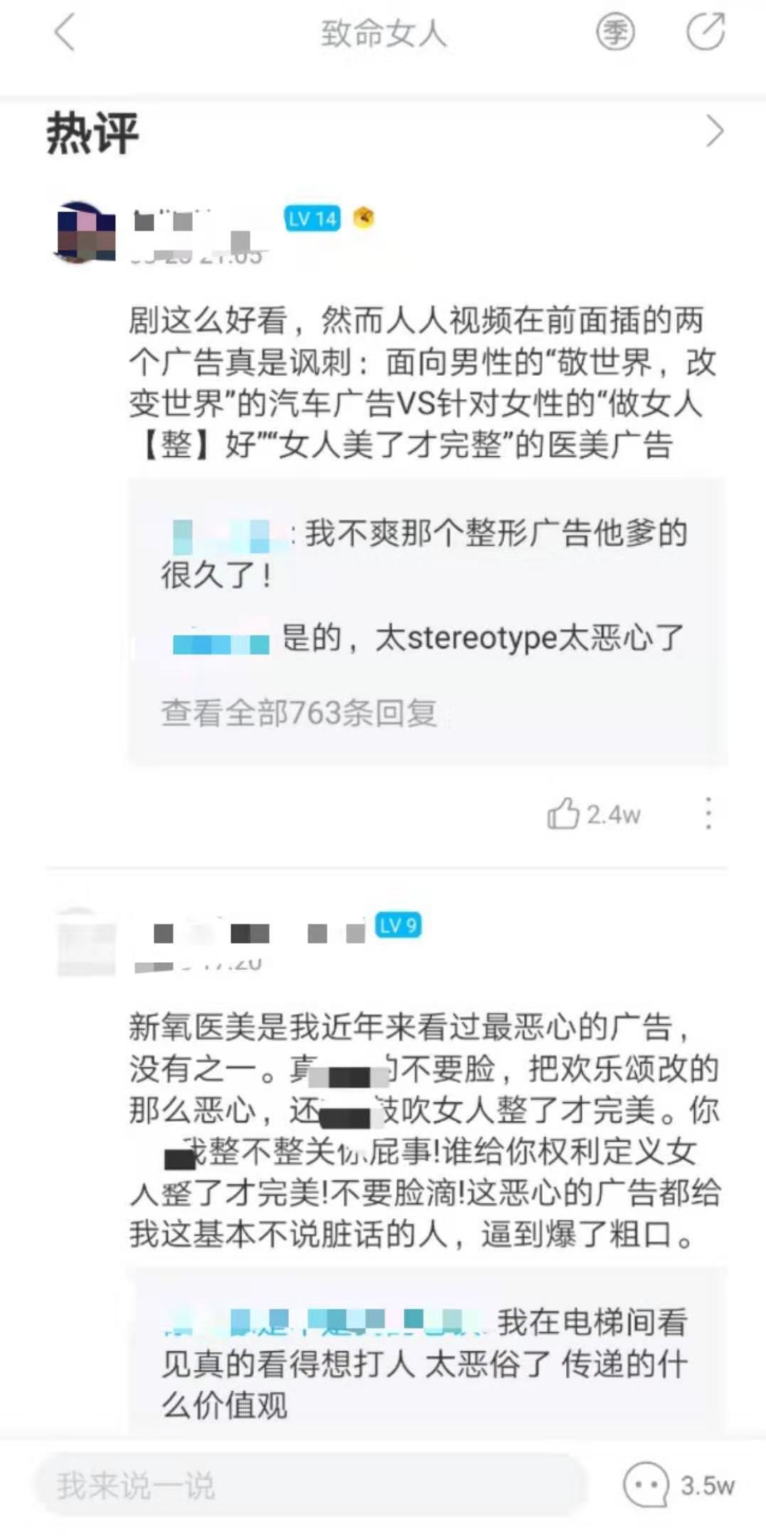 但在近期,某医美广告内容却引起了一些人人视频用户的反感,在目前最热的美剧《致命女人》下方,热评前三均是用户对此广告的吐槽。