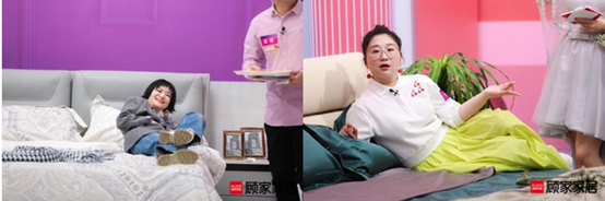 除了频爆金句之外,两对明星夫妻也分别与顾家产品进行了亲密互动,助推直播间的热度持续飙升,脱口秀女王思文和人气辩手傅首尔在直播中分别替粉丝们体验了顾家的两款婚床。
