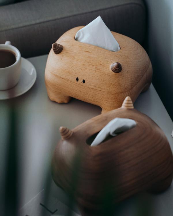 【大角怪】是原上城制作的木质纸巾盒产品,与普通纸巾盒不同的是,它胖墩墩地身体上长了两只尖角,一双圆溜溜的小眼睛,活灵活现。