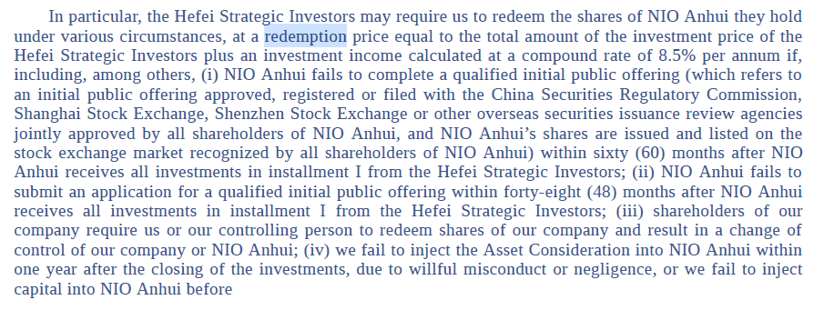 在蔚来中国完成重组合IPO之前,蔚来和/或蔚来指定的第三方也有权回购合肥建恒新能源汽车投资基金的一半股份,赎回价格为双方商定的赎回价格。此外, 2021年12月31日之前 ,我们或我们指定的机构有权认购蔚来中国不超过6亿美元的新发行股票,而合肥战略投资者对于这些新发行股票没有认购权。在我们的赎回权实现时,我们可能无法赎回NIO安徽的股份,也可能无法实现合肥投资协议中规定的预期收益。