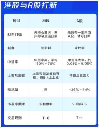 港股打新与A股打新有何异同呢? 首先,在港股认购新股只需港股账户,并没有个股持仓要求。而A股则需要持有一定市值的股票才可打新,沪港通也还没开通打新业务。其次,港股与A股的上市制度也有所不同,港股采用了市场化程度较高的注册制,比A股的审批制更为宽松,没有市盈率的要求,因此企业赴港上市的节奏比起也会稍快。此外,港股中签率较高,平均达50%-70%;A股打新中签率极低。