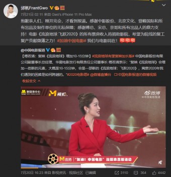 随即《流浪地球》的导演郭帆也转发相关内容表示,感谢中影股份、北京文化、登峰国际和所有出品及制作单位的无私保障,并表示将复映的所有票房捐助给影院。