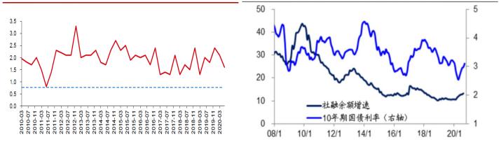 另一方面,超储率的低位反映出银行的信用派生能力已经接近瓶颈。8月的估算超储率已经下降到接近1%的水平,仅次于2011年二季度的历史*点0.8%,也远低于央行货币政策报告中提及的1.5%-2%的合意区间,意味着在当前法定准备金率水平下的银行体系信用派生已经接近瓶颈。