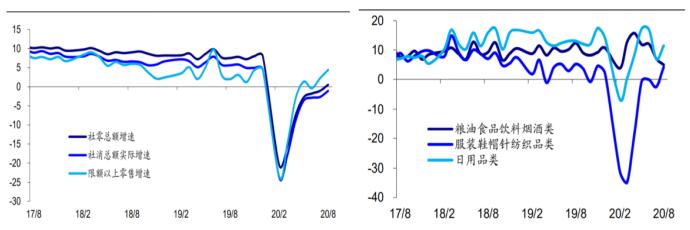 8月份社会消费品零售总额增速由负转正至0.5%,前值降1.1%,实现年内首次正增长,限额以上单位消费品零售额增速继续回升至4.4%,消费的恢复速度短期有明显加快。必需消费涨多跌少。