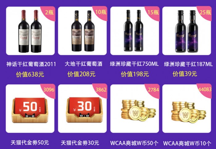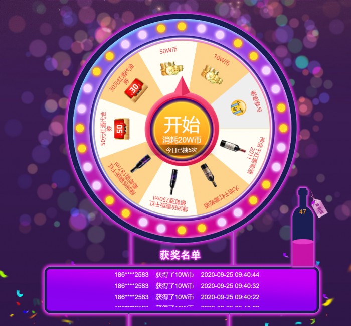 参与方式:WCAA赛事平台注册用户每天可以参与*10次,每日可免费*一次,第2-4次需消耗10W币,第5-7次需消耗20W币,第8-10次需消耗30W币。进入*页面点击开始即可使转盘转起来哦,累计*会提升幸运值(瓶内红酒越多越容易中大奖哦~)。