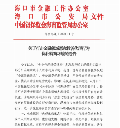 就在近日,继全国多地监管局多次加强对“保险全额退保”的管控后,中国银保监会海南监管局正式发布《关于打击金融领域恶意投诉代理行为 优化营商环境的通告》,将严厉打击捏造事实的恶意投诉行为,并追究其相关法律责任。同时警示消费者要准确识别“代理退保退息”诈骗手法,要通过正规渠道充分了解金融保险产品信息,树立依法维权意识;并督促金融机构要加大对消费者金融知识普及宣传,强化投诉管理,完善消费者权益保护机制体制的建设,有效提升客户满意度。