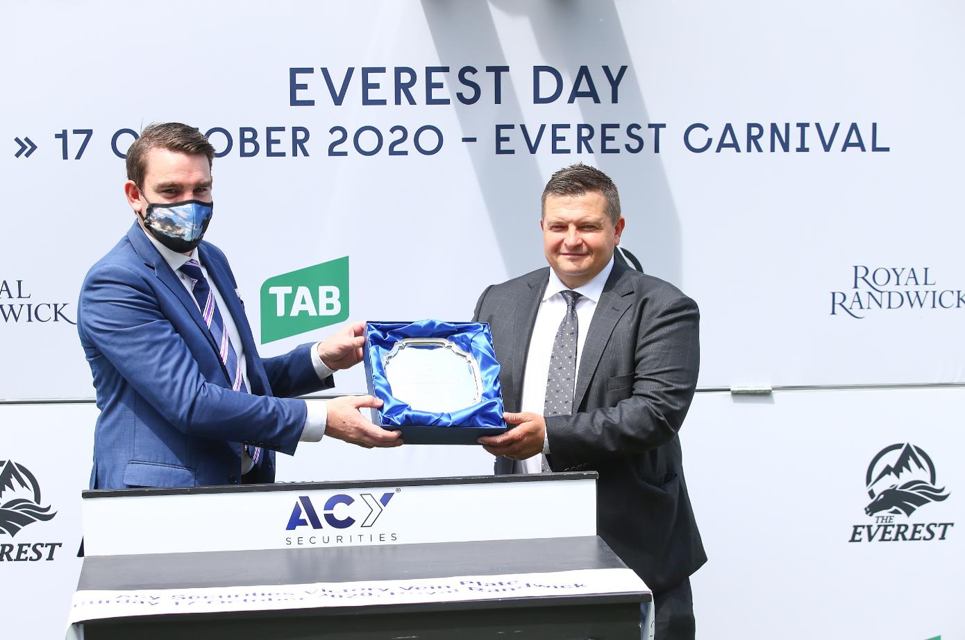 澳大利亚赛马俱乐部(ATC)企业合作总经理Scott Kennedy先生代表ATC欢迎ACY稀万证券来到冠军马主大厅(Winning Owners Room)共同庆祝,在这里将“ACY稀万证券杯”授予该场赛马冠军Captivant。