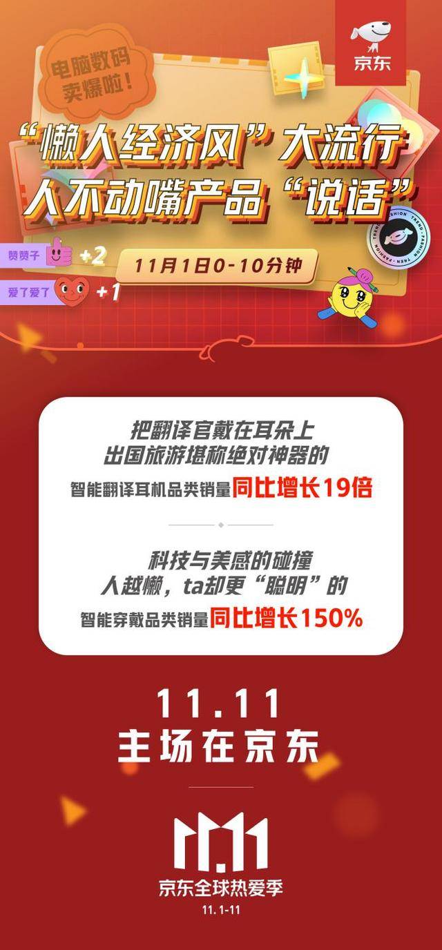 智能穿戴设备给犯懒的人们提供了一个漂亮的借口,毕竟有了*的AI,哪里还用得着大家亲自动脑呢?京东电脑数码11.11一号当天,仅10分钟时间,智能翻译耳机品类销量同比增长19倍,耳朵上自带的翻译官,再也不用尴尬的跟外国友人来场比划式聊天了,堪称出国旅游的*神器!