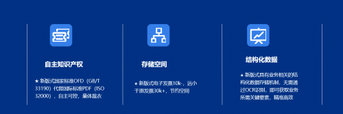为什么使用OFD版式呢?OFD版式有以下优点:拥有自主知识产权,自主可控,量体裁衣;存储空间小,一般在10K以下,小于原发票;自带结构化数据存储机构,无须OCR识别,即可获取业务所需关键要素,精准高效。