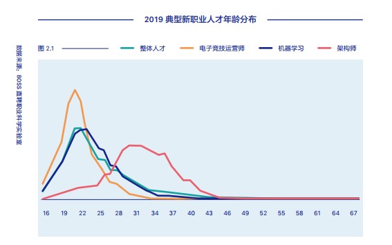 在BOSS直聘的报告分析中,选了三个比较典型的新兴职业岗位,深入观察新职业人才平均年龄与人才存量增速的特点。这三个新职业分别是电子竞技运营师、人工智能领域的机器学习岗位、云计算领域的架构师。从事这三个职业的云计算岗位平均年龄超过了30,而电子竞技岗位的平均年龄只有22.9岁。而在BOSS直聘的报告分析中显示,网络直播等新职业人才是爆发式增长,并且是高度低龄化。