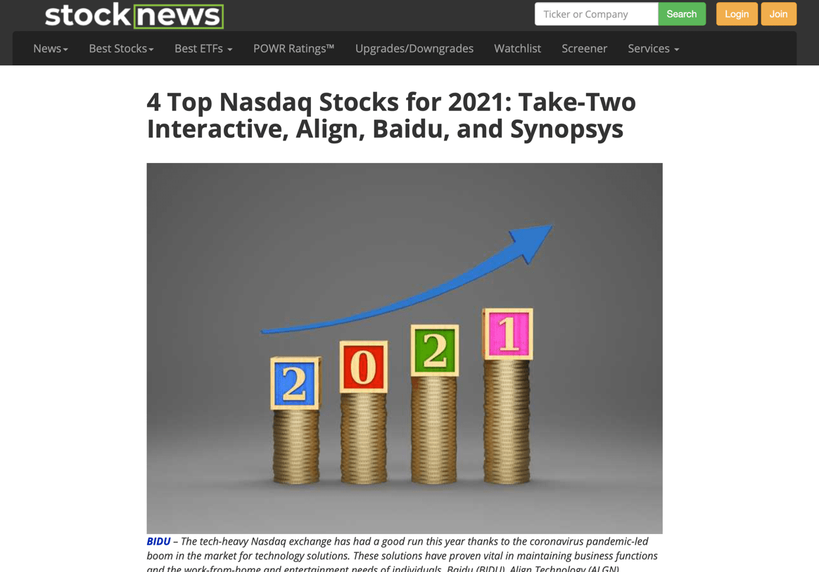 具体来看,鉴于百度今年的业绩增长,Stocknews认为,百度在中国的115支股票中*,同时也将是2021年纳斯达克排名前四的股票。分析师预测,2020年百度的营收将增长6.7%,2021年Q1营收将增长23.9%,2021全年营收将增长15.1%。预计百度每股收益今年将增长25.9%,明年将增长12.1%。因此,投资百度将是明智之举。