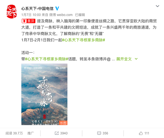 为紧随时代步伐,把握用户需求,更好的传承“中华商脉”文化。心系天下官方于1月7日-2月8日在心系天下-中国电信官方微博、心系天下官方微信等自媒体平台发起了#心系天下寻根中华商脉#的活动,鼓励人们拿起手机去记录与家乡商脉有关的内容,将“中华商脉”文化传播到更多地方,也将“中华商脉”的文化传承进一步与品牌结合,更好的传达心系天下产品理念。