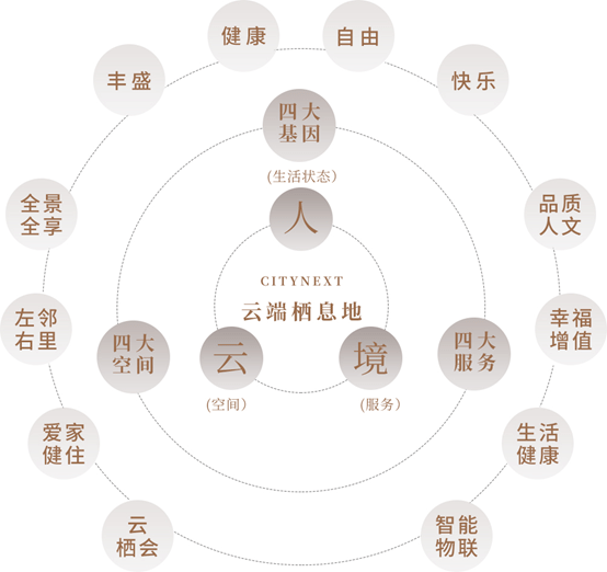 四大空间系统,是满足客户需求的一个重要落脚点,包含了全景全享、左邻右礼、爱家健住、云栖会四个层次;