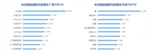 从厂商层面来看,关注新能源新车的车主自主品牌占比高,前10名中有5个席位均为自主品牌。其中,关注新能源新车的原车厂商TOP10中比亚迪关注度最高,达到8.75%,长安汽车则凭借5%的关注度位列第二,吉利汽车、上汽通用五菱、北汽新能源均榜上有名。