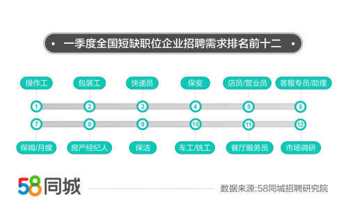 据58同城招聘研究院数据显示,今年*季度,全国短缺职位重点职位中,快递员招聘需求环比上升*,增速67.83%。随着春节后物流配送恢复常态,企业对快递员的需求也随之增长,招聘需求快速上升。此外,车工/铣工、操作工、包装工的招聘需求环比也均有15%以上的增幅。可见,节后制造业复工复产较快,企业对制造业岗位的招聘需求集中释放。58同城招聘研究院数据还表明,餐厅服务员、房产经纪人、店员/营业员的招聘需求环比小幅上升。这表明,节后生活性服务业市场需求回暖,相应岗位招聘需求增加。