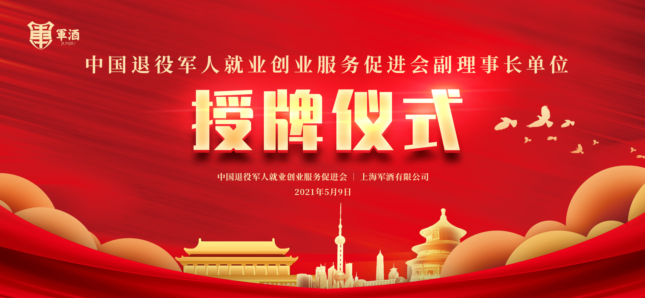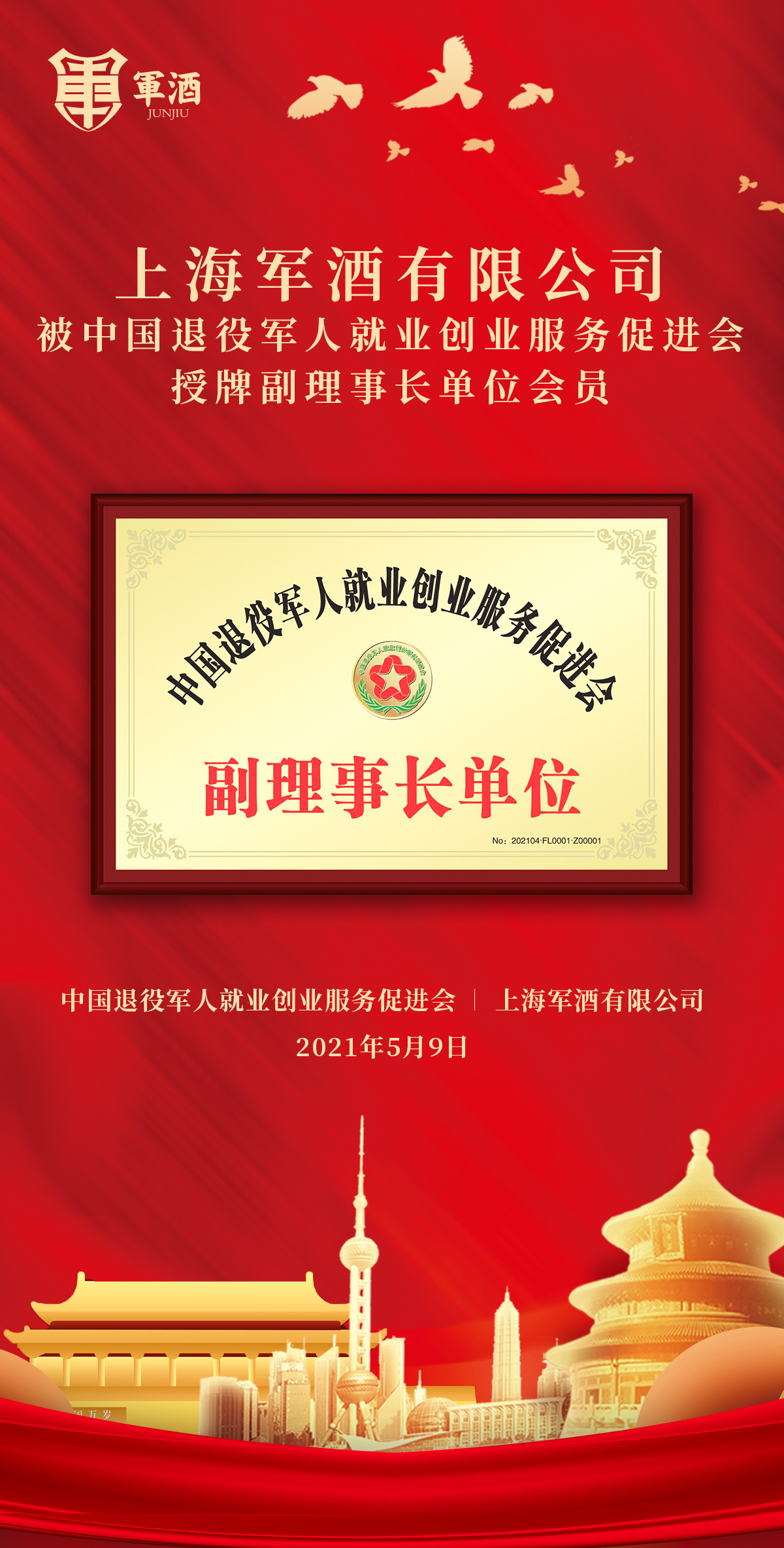 由国家退役军人事务部相关部门推荐,上海军酒有限公司被中国退役军人就业创业服务促进会评为副理事长单位会员。5月9日,中国退役军人就业创业服务促进会副理事长单位会员授牌仪式在北京隆重举行。中国退役军人就业创业服务促进会理事长王义将军、常务副理事长林岗将军、常务副理事长王惠德将军、副秘书长苏纯明、副秘书长罗军,上海军酒有限公司创始人韩宏伟,上海贵酒股份有限公司总裁高利风、副总裁徐勇,上海军酒总裁金朝晖、副总裁林晓东出席了授牌仪式。