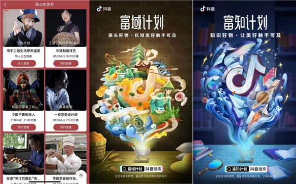 对于以往那些有才能、有资源但少平台的人而言,抖音电商平台也为他们提供了发展契机:在抖音电商,不少传统手艺人发现了新顾客,油纸伞、陶器等传统小众的工艺产品更容易被消费者看到;抖音电商还打造了“非遗专区”,让热爱非物质文化遗产的人们在手机上就能看到各地文化遗产,助力非遗传播。再加上抖音电商推出的“抢新年货节”、“富域计划”、“富知计划”等IP品类活动,充分释放了兴趣内容的变现能力,成为撬动流量的重要支点。