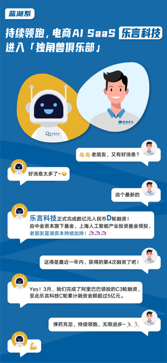 4月25日,电商AISaaS独角兽「乐言科技」宣布完成数亿元人民币D轮融资,由中金资本旗下基金、上海人工智能产业投资基金领投,老股东蓝湖资本持续加仓。这是公司在最近一年内获得的第4次融资,已成为独角兽公司。