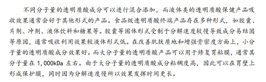 其次,透明质酸食品的效果通常取决于其分子量大小,人体吸收程度的高低与透明质酸成分分子量相关。透明质酸根据分子量的范围,可分为大分子、中分子、小分子、寡聚透明质酸等类别。我们常见的作为塑形填充材料应用于医疗美容中的透明质酸,分子量较大,具有更强的支撑性、抗降性和黏弹性。分子量较小的透明质酸,能够穿透表皮实现皮肤深层吸收,因此常用于保湿类的护肤品中。而应用于食品中的透明质酸通常为小分子量的产品,服用后人体吸收效果更佳。