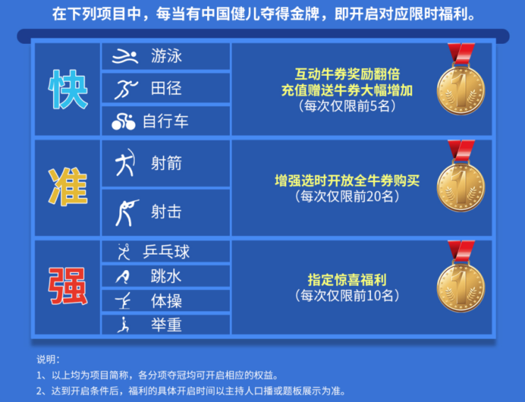 在游泳、田径、自行车、射箭、射击、乒乓球、跳水、体操、举重等热门比赛项目中,中国健儿获得金牌,参与用户还可开启对应的限时福利。