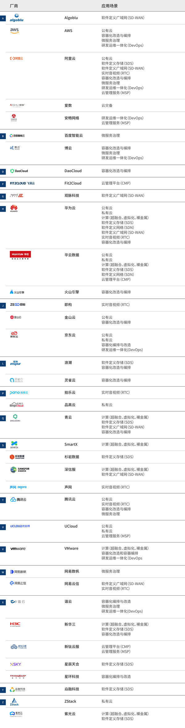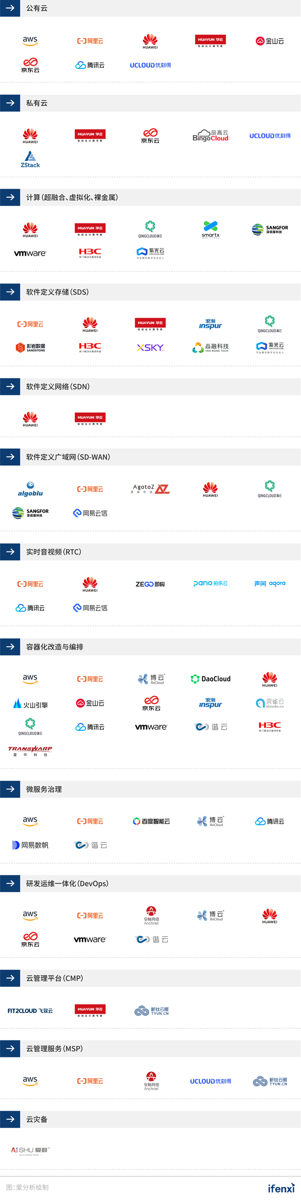 爱分析基于对甲方企业和典型厂商的调研以及桌面研究,遴选出在云计算场景中具备成熟解决方案和落地能力的代表厂商,如下图所示。