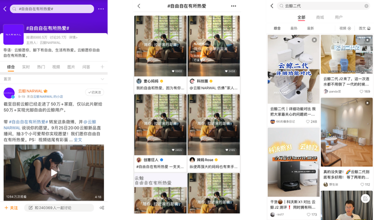 在传播角度,云鲸智能依托直击用户痛点的优质内容,建立了直播间+短视频+社交平台三位一体的联动打法。,云鲸借助微博、抖音、小红书等社交平台持续加持曝光度,引爆热点话题,促进内容多次发酵,进一步完成品牌与产品的有效渗透与有力种草。