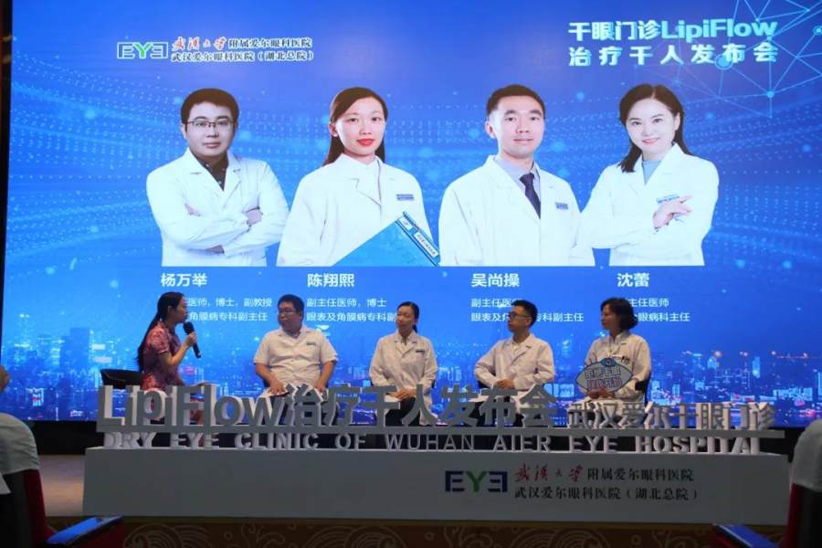 本次发布会邀请到中华医学会湖北分会常务理事、中华医学会专家会员、主任医师,教授,博士生导师邢怡桥;副主任医师沈蕾;爱尔眼科医院集团湖北角膜眼表学组副组长、副主任医师吴尚操;爱尔眼科医院集团角膜及眼表学组秘书、爱尔眼科医院集团湖北省区角膜眼表学组副组长、博士、副主任医师陈翔熙;博士、副主任医师、副教授杨万举等眼科专家出席,就干眼的实用诊疗技术进行了深入的交流。