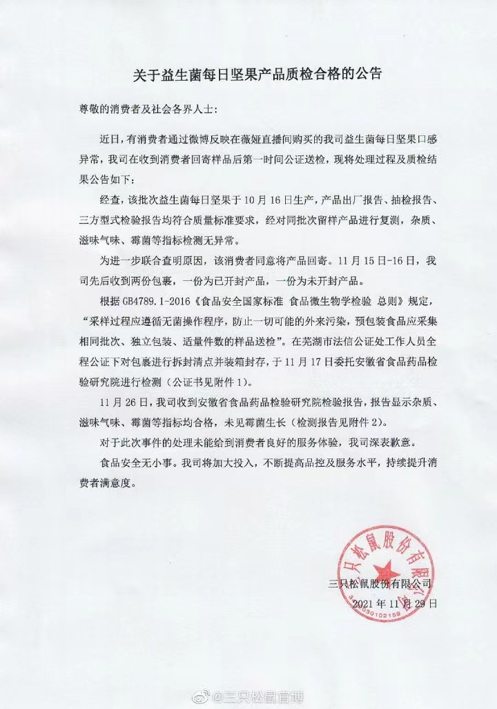 11月29日,三只松鼠在官博公布了送检产品的质检结果,无异常,同时附带了检测的详细报告,并向消费者表达歉意。可以说,这是负责任的态度——既对消费者负责,也对合作的电商主播薇娅负责。而随着检测报告的发布,也让人多多少少感觉,电商主播是“躺枪”了。