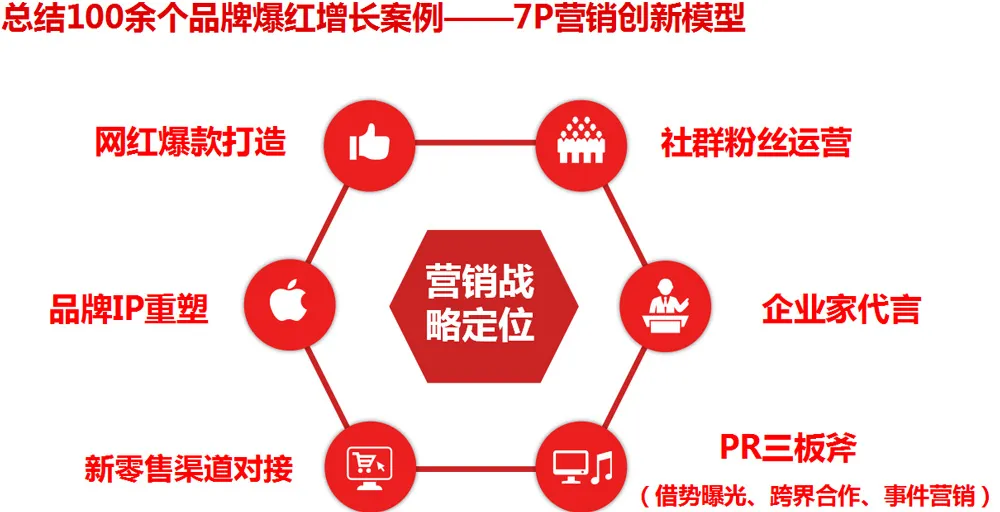 我们用一本系统化的《新消费新营销》这本书总结了中国本土营销的创新发展,并在书中提出了PMC爆红营销传播理论和和品牌势能定律 。我们*次根据新商业环境下的新媒体新零售新消费发展变化情况,将传统营销理论中定位、品牌、产品、渠道、市场、CR客户关系、PR公关等分裂的功能模块进行融合再造,针对新时代背景下的企业营销玩法和品牌发展现状,提出了全新一代的7P爆红营销落地方法模型:市场增长战略定位、企业家代言、品牌IP塑造、网红爆款打造、PR三板斧引爆、社群粉丝运营、新零售渠道分销。传统营销历经百余年发展,从制造生产批发模式到渠道分销产品USP模式再到4P4C市场营销阶段到战略营销和客户关系管理到IMC整合营销传播到定位聚焦营销到网络营销口碑营销,而PMC爆红营销传播理论的提出则是对国内最近几年营销环境客观变化以及本土营销实践创新规律的总结。PMC爆红营销传播理论应运而生,成为广大新消费品牌中小企业突围和迫切需要削减广告预算的传统企业进行创新营销的必然选择。