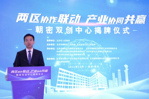 12月30日,由北京市人民政府指导,朝阳区人民政府、密云区人民政府主办的2021北京“朝密双创中心”揭牌仪式正式举行。密云区委常委、常务副区长王永浩,朝阳区副区长、发改委主任李欣,朝阳园工委委员、常务副主任苏向东,密云区政协副主席王武军,密云区发改委主任李東方,中关村密云园工委副书记李友生,朝阳区发改委四级调研员张晓东,朝阳区国资委副主任曲汉卿,北京望京新兴产业综合开发有限公司董事长王忠参与仪式并为“朝密双创中心”揭牌。