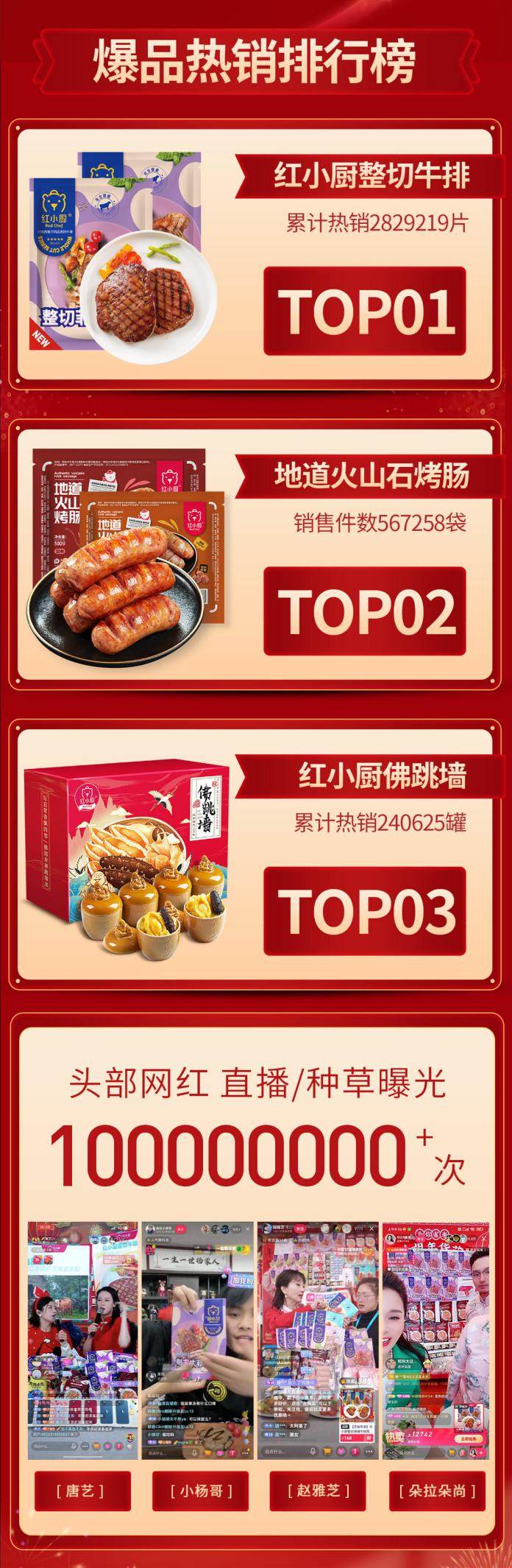 红小厨最初是以网红美食小龙虾切入预制菜市场的,并很快成为全网虾类制品*的品牌,最近一年多来,他们围绕家庭的早中晚餐及下午茶和夜宵的消费场景,又推出了虾饺、烤肠、牛排、鸡排等多个系列近百款产品,并联袂知名大厨,出品了号称“国宴名菜”的佛跳墙礼盒,并以高还原度口味、高价格品质适配度,高居年货礼盒销量TOP榜。