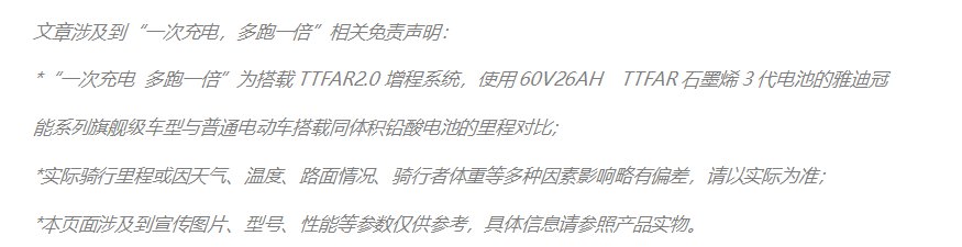8月,在高原极端环境下,雅迪冠能二代系列电动车凭借动力强劲、续航里程长,加之*减震、高能量回收率等*性能,顺利完成了“骑冠能去火星”探索之旅;随后在11月,搭载TTFAR石墨烯3代电池的雅迪冠能二代E8成功禁受住了“中国最冷小镇”的极寒考验,完成了“一次充电超200公里”超低温续航里程,彻底终结用户低温续航的焦虑,率先开启冬季长距离骑行新时代。