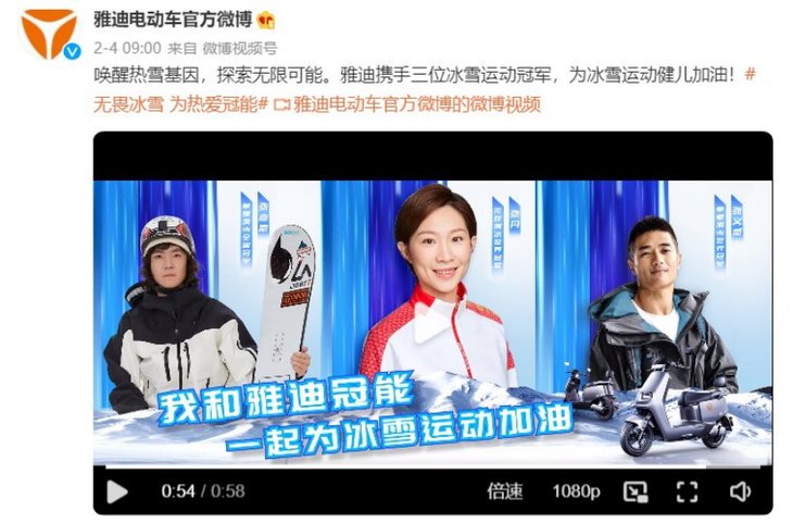 一场精彩纷呈的冰雪盛会正如火如荼地开展,“冠军”成为了万众瞩目的期待。在赛场上,来自全球各国的冰雪健儿挥洒汗水与梦想,而赛场下,什么才是冠军实力也拥有了新的注解。作为全球电动两轮车行业领航者,近日,雅迪电动车与滑冰世界冠军张丹、单板滑雪世界冠军张义威、单板滑雪全国冠军张嘉豪三位冰雪运动冠军共聚,为用户出行冠能,带来理想的骑行体验。