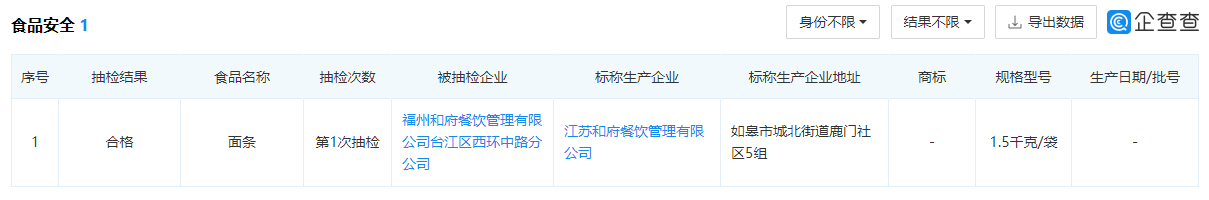 和府捞面成立于2012年,并与2013年开出首家门店,至今已有10个年头。据企查查公开信息显示,和府捞面关联食品安全抽查结果合格。