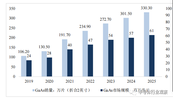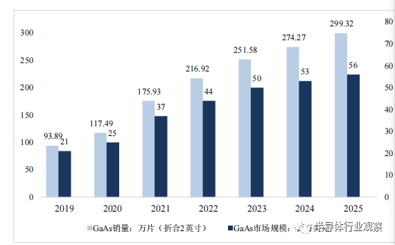 激光器是使用受激辐射方式产生可见光或不可见光的一种器件,构造复杂,技术壁垒较高,是由大量光学材料和元器件组成的综合系统。利用砷化镓电子迁移率高、光电性能好的特点,使用砷化镓衬底制造的红外激光器、传感器具备高功率密度、低能耗、抗高温、高发光效率、高击穿电压等特点,可用于人工智能、无人驾驶等应用领域。根据 Yole 预测,激光器是砷化镓衬底未来五年*的应用增长点之一。预计到2025年,全球激光器砷化镓衬底(折合二英寸)的市场销量将从2019年的106.2万片增长至330.3万片,年复合增长率为20.82%;预计到2025年,全球激光器砷化镓衬底市场容量将达到 6,100 万美元,年复合增长率为 16.82%。据YOLE数据分析,激光器器件销售与市场规模预测如下: