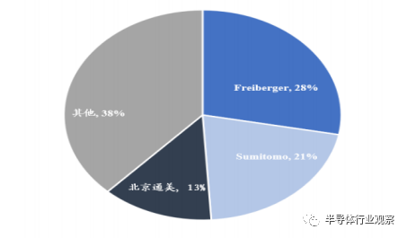 4、6 英寸半绝缘砷化镓抛光片生产技术主要掌握在日本住友电工(Sumitomo Electric Industries)、德国费里伯格(Freiberger Compound Material)、美国 AXT 三个公司手中。这些公司的产品占据着砷化镓市场的绝大部分份额。砷化镓单晶生长技术也向成晶率高、成本低的VB/VGF单晶生长技术转移。至2015年,6英寸衬底已占据市场份额90%以上。销售的6英寸半绝缘砷化镓产品的电阻率从107Ω·cm覆盖到108Ω·cm,具有较高的晶体轴向和径向电阻率均匀性。抛光片的加工几何参数如TTV、Warp、LTV也很小。抛光片表面质量状态也优良,如颗粒少,表面进行钝化处理,产品的保存时间长。具体世界市场分布如下图: