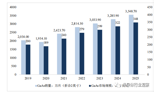 图七、2019-2025 年全球激光器器件砷化镓衬底预计销量和市场规模