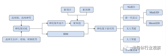 砷化镓产业链上游为砷化镓晶体生长、衬底和外延片生产加工环节。衬底是外延层半导体材料生长的基础,在芯片中起到承载和固定的关键作用。生产砷化镓衬底的原材料包括金属镓、砷等,由于自然界不存在天然的砷化镓单晶,需要通过人工合成制备;砷化镓衬底生产设备主要涉及晶体生长炉、研磨机、抛光机、切割机、检测与测试设备等。砷化镓产业链下游应用主要涉及5G通信、新一代显示(Mini LED、Micro LED)、无人驾驶、人工智能、可穿戴设备等多个领域。