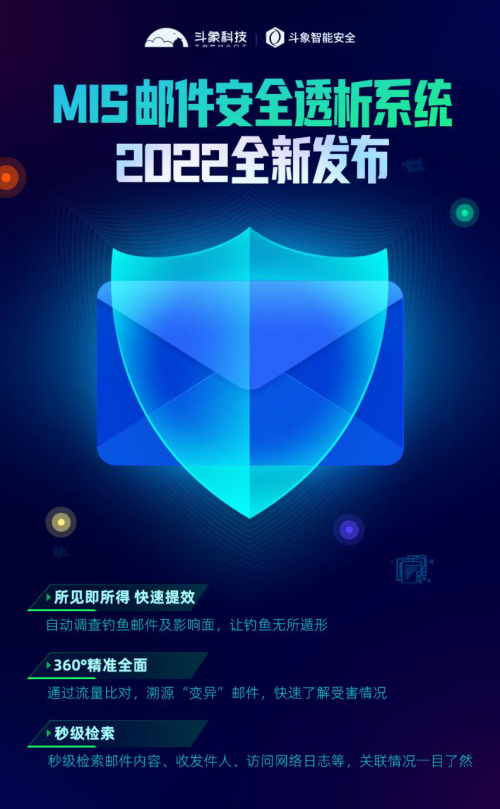 斗象科技正式发布2022年*新品「MIS邮件安全透析系统」。MIS聚焦钓鱼邮件对企业安全的威胁分析与影响面研判,通过四大核心功能亮点,帮助企业快速完成钓鱼邮件的识别、定位及影响面分析,协助安全运营人员高效完成钓鱼邮件、APT邮件钓鱼行为的发现、判断及响应处理。