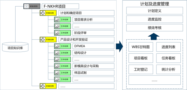 按照产品规划阶段定义的Offering级别,定义多种项目模板,适应不同类型研发项目,实现流程裁剪,即避免流程僵化过度管理,也避免必要的流程缺失导致出现质量问题;在流程模板中,按照IPD思想,设置矩阵式跨部门PDT项目团队,职责清晰、高效协作;通过在项目模板中设置文档交付物模版、任务检查&测试项等管理要素,实现情景化知识推送,确保流程被规范化执行;以项目WBS为主线,设置项目执行过程中各种跨部门的端到端子流程,实现流程自动驱动。