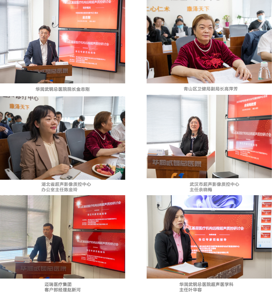 青山区卫健局副局长高萍芳,华润武钢总医院院长金志刚、副院长黄宣哲,湖北省超声影像诊断与治疗质量控制中心办公室主任陈金玲教授,武汉市超声影像诊断与治疗质量控制中心主任余晓梅教授、华润武钢总医院超声医学科主任叶华容教授以及青山区14家社区卫生服务中心主任及超声科医师出席本次会议。