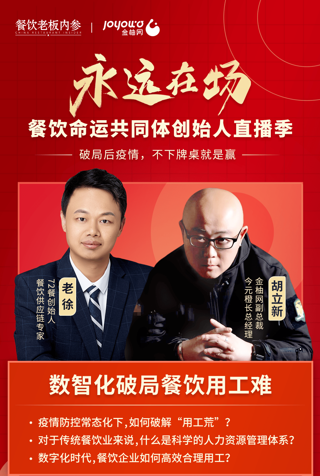 近日,金柚网副总裁、今元橙长总经理胡立新,在餐饮行业知名媒体「餐饮老板内参」直播间分享“数智化破局餐饮用工难”,和72餐创始人、餐饮供应链专家老徐在线深度对谈,围绕后疫情时代餐企用工痛点,为广大餐企提供数智化用工新思路。