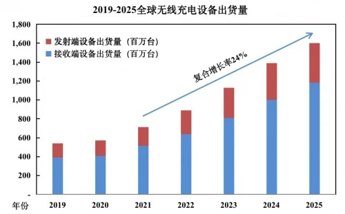 无线充电市场在可穿戴设备年复合增长率40.96%的高速驱动下,在智能家居、机场、汽车、酒店等更多应用场景的渗透下,表现更为强劲。Strategy analytics数据显示,2021年度全球无线充电设备的整体出货量较2020年度增长近30%。预计到2025年,无线充电设备出货量的复合增长率将保持在24%以上。