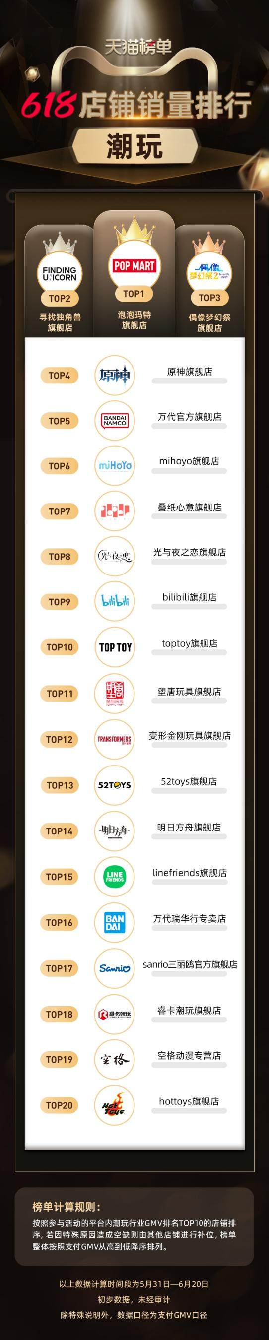 日前,天猫发布的2022年“618潮玩销量排行榜”显示,泡泡玛特旗舰店、寻找独角兽旗舰店、万代官方旗舰店等以手办盲盒为主的品牌持续保持高增长,蝉联行业TOP。更值得关注的是,新晋黑马偶像梦幻祭旗舰店、原神旗舰店分别跻身第3、第4位。在行业TOP20榜单中,游戏厂牌更占6席,创下行业新高。