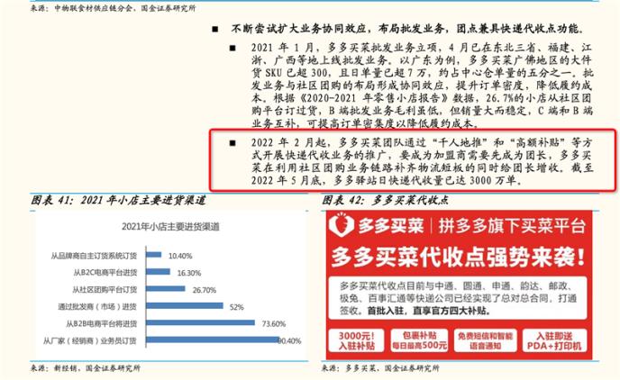 日前,国金证券发布社区团购相关行业研报,研报称,自2022年2月起,拼多多旗下多多买菜团队通过“千人地推”和“高额补贴”等方式开展快递代收业务的推广,截至2022年5月底,日快递代收量已达3000万单。