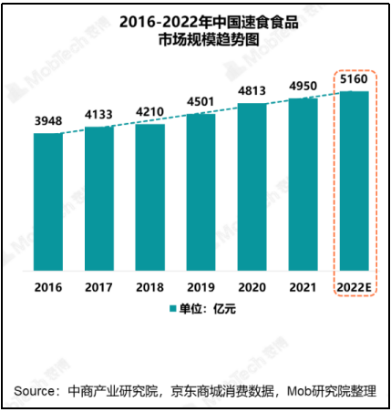 据中商产业研究院京东商城消费数据,2020年我国速食食品市场规模为4813亿元,2021年为4950亿元,预计2022年将达5160亿元。