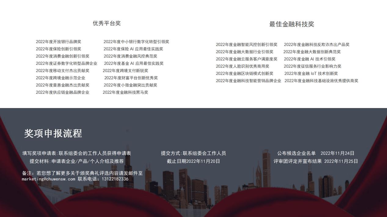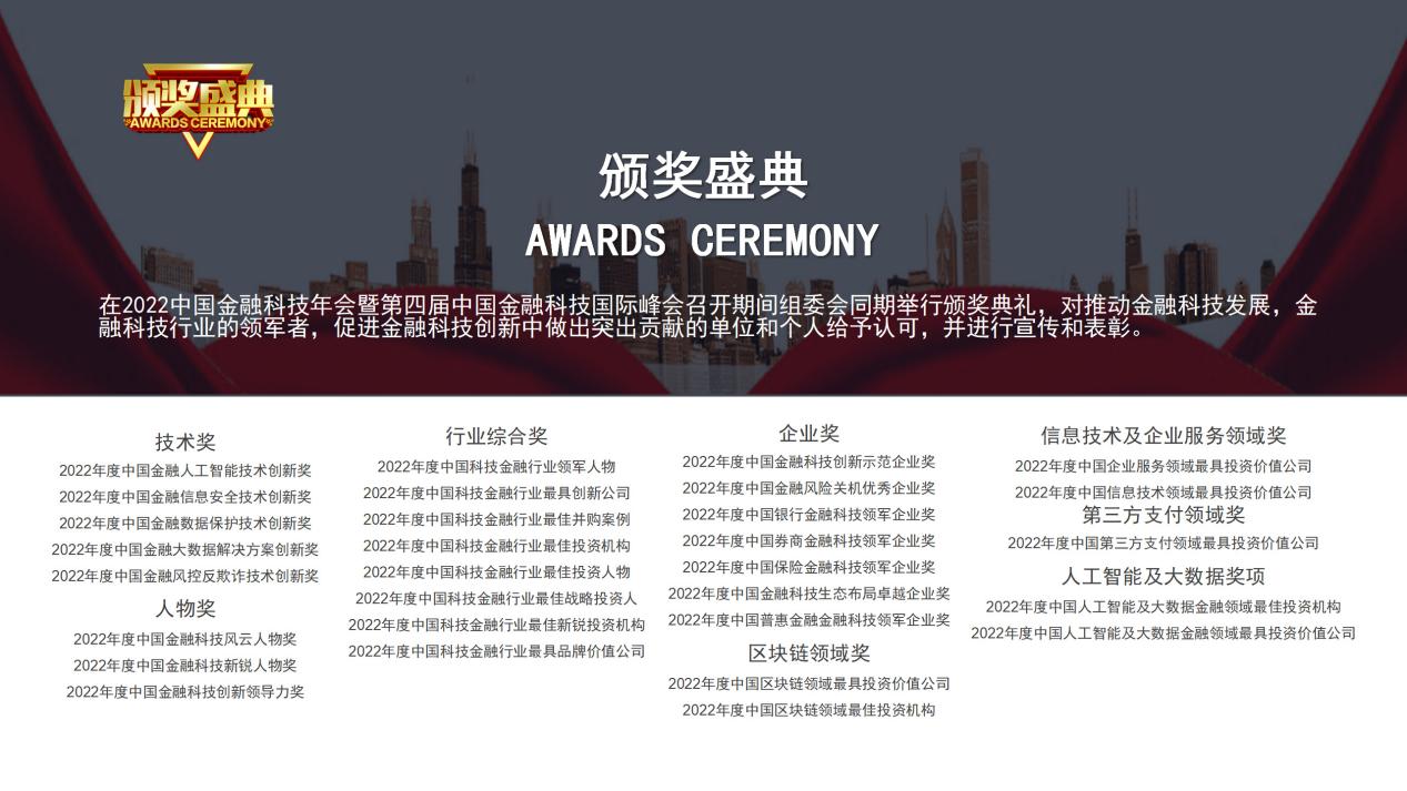 在第 四届中国金融科技峰会召开期间组委会同期举行颁奖典礼,对推动金融科技发展,金融科技行业的领军者,促进金融科技创新中做出突出贡献的单位和个人给予认可,并进行宣传和表彰。