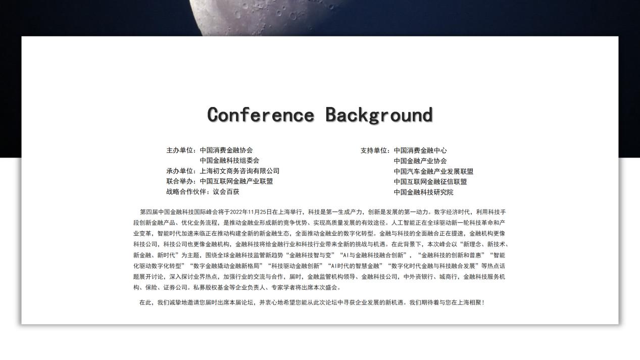 第 四届中国金融科技峰会将于2022年11月25日在上海举行,科技是第 一生成产力,创新是发展的第 一动力。数字经济时代,利用科技手段创新金融产品、优化业务流程,是推动金融业形成新的竞争优势、实现高质量发展的有效途径。人工智能正在全球驱动新一轮科技革命和产业变革,智能时代加速来临正在推动构建全新的新金融生态,全面推动金融业的数字化转型。金融与科技的全面融合正在提速,金融机构更像科技公司,科技公司也更像金融机构,金融科技将给金融行业和科技行业带来全新的挑战与机遇。在此背景下,本次峰会以“新理念、新技术、新金融、新时代”为主题,围绕全球金融科技监管新趋势“金融科技智与变”“AI与金融科技融合创新”,“金融科技的创新和普惠”“智能化驱动数字化转型”“数字金融撬动金融新格局”“科技驱动金融创新”“AI时代的智慧金融”“数字化时代金融与科技融合发展”等热点话题展开讨论,深入探讨业界热点,加强行业的交流与合作,届时,金融监管机构领导、金融科技公司,中外资银行、城商行,金融科技服务机构、保险、证券公司。私募股权基金等企业负责人、专家学者将出席本次盛会。