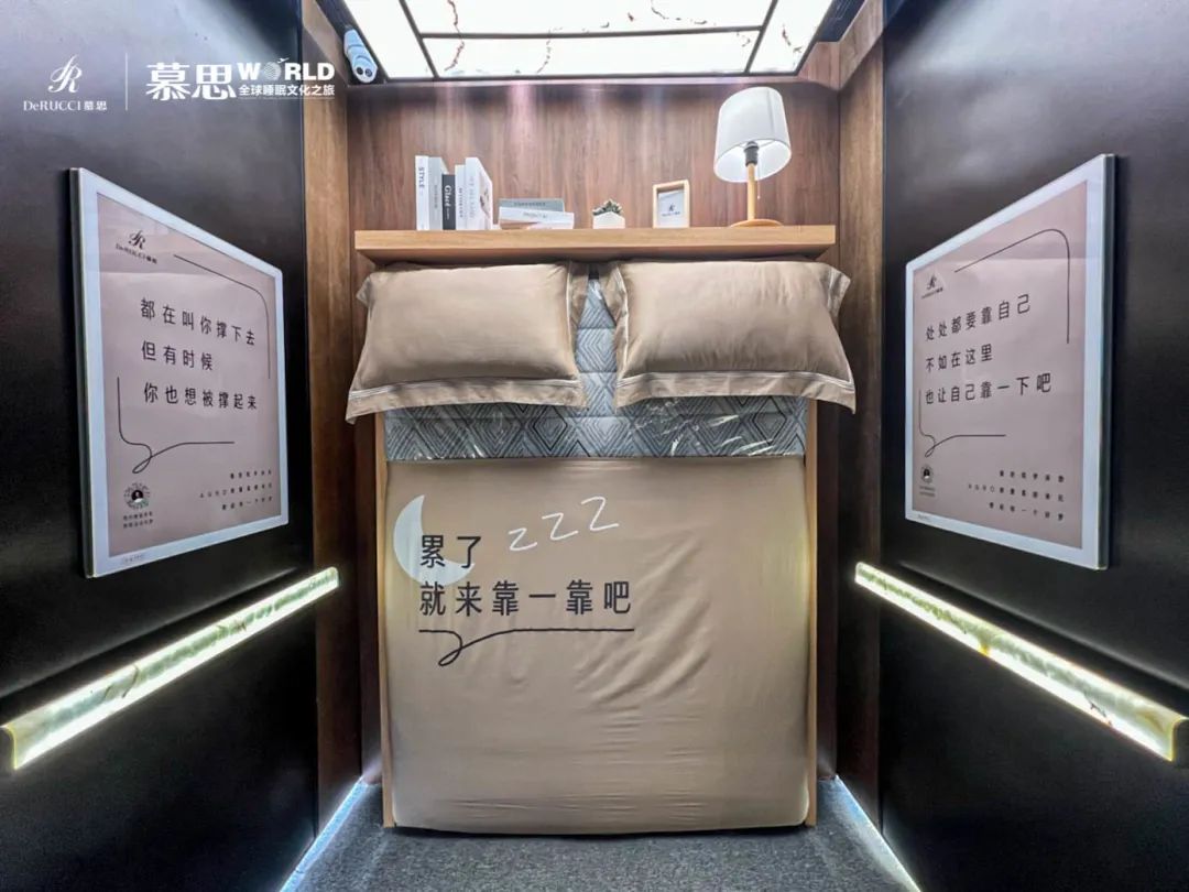 在品牌内容创意的形式与落地上,解锁了一种新玩法,慕思策划了一个线下写字楼筑梦电梯事件。8月13日,慕思在深圳中心地段的办公楼里设置了一个特殊的床垫体验空间,将乒乓球世界冠军张继科同款床垫(上市纪念款:MZZ1-088 筑梦床垫)放入电梯,打造了一间特殊的电梯沉浸式床垫体验空间,希望焦虑的上班族能破除焦虑,旨在传达健康睡眠的重要性,以此作为今年818慕思全球睡眠文化之旅的开端。